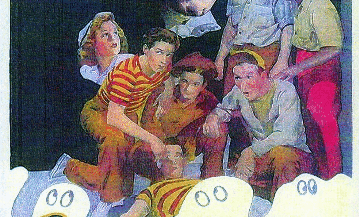 Nardo and Luigi encounter the Monster in the hallway. Nardo says the ghost has made a mistake and then falls down the stairs. The ghost is really three kids in a trench coat with a skull on top. They soon find Peewee back in his bed, feeling much better now.