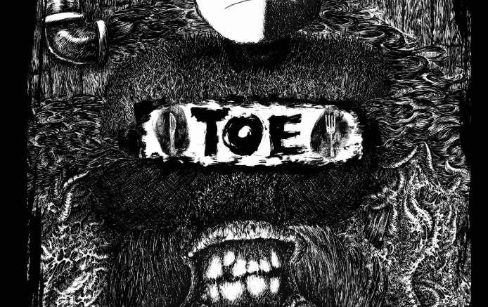 We watch an animated boy walk through the desolation, looking for food. Instead, he finds a toe buried in the ground. He hacks it off whatever it was connected to and takes it home to cook and eat it.