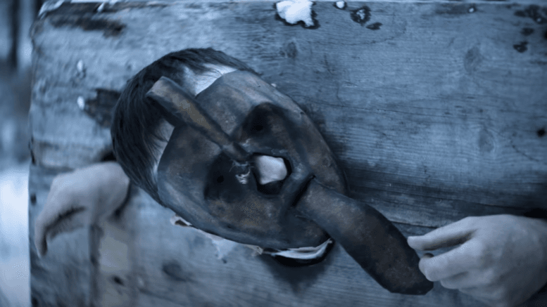 A man brutally murders a snowman and then stomps on presents. He then tackles one of those bell-ringers and beat him to death. There are a “Gossip” and a “Sinner” in medieval stocks wearing pig masks. The politician gets an even worse fate. The Gossip, one of the guys in the stocks, starts to torment the other, the Sinner, in the only he can in the current situation.