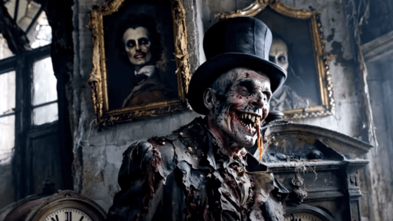 This one has no story, none at all. It’s a slideshow of animated AI-generated zombies and corpses, all in weird poses, sometimes moving in frightening ways through an old mansion by the sea. The video is purely visual, although the music is appropriate to what we see. There’s no dialog or sound effects other than the music.