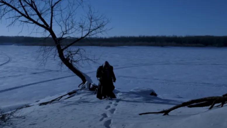A woman tries to get into a snow-covered truck on a deserted road. There’s a dead man inside under a blanket. It’s very cold and desolate here, and she has to use a rock to break open a can of food. Night falls, and she makes a campfire.