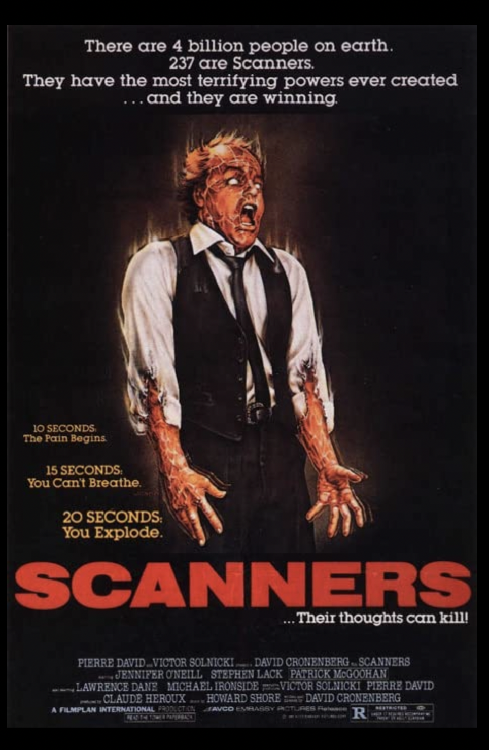 A man who claims to be a Scanner is doing a presentation in front of an audience. He asks for a volunteer to come up and concentrate. The man looks like he’s in pain, and the volunteer looks angry. They seem to be having a mental battle, and the volunteer starts to smile as the first man’s head explodes violently.