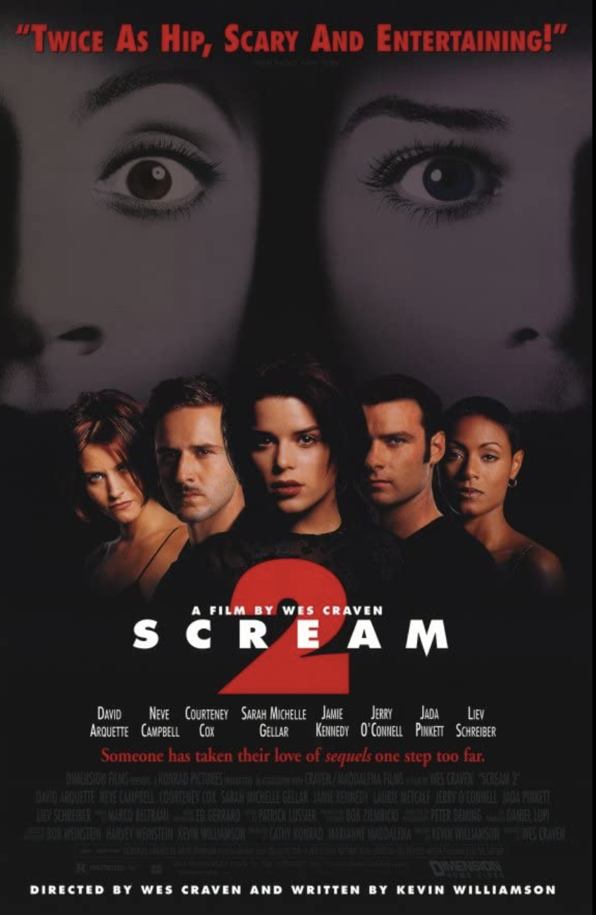 We open on the premiere of the new film, “Stab.” Maureen and Phil are in line talking about how tacky horror movies are and how horror films exclude black folks. Everyone in the theater is wearing Ghostface masks as the movie is all about what happened in the previous film and written by Gale Weathers. It starts with Casey getting naked. Apparently, nudity is a requirement in the movies, because that didn’t happen in reality. Then her phone rings… Maureen goes out to the lobby for popcorn and overhears how the film is all based on a true story. Phil goes to the restroom, and gets stabbed in the ear. Ghostface then goes into the theater and sits next to Maureen, stabbing her. Credits roll.