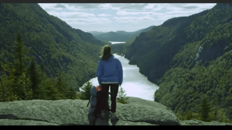 Immediately, the music changes and things start getting lighter, she smiles a lot more as things become more and more green. She parks the car and walks down a path. There’s no one around, and it all looks very isolated now.