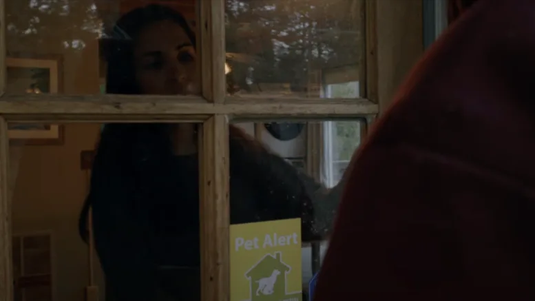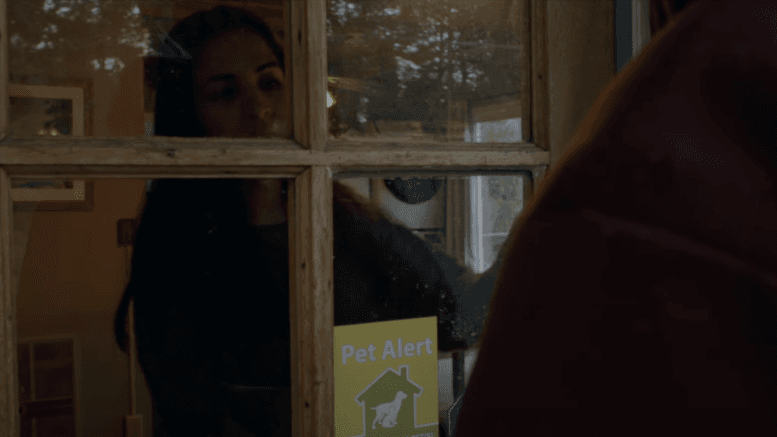 That evening, we see that someone is watching her through the windows. She wakes up to see flashing red and blue lights outside. Did the cops stop someone? She goes outside to investigate. While she’s outside, someone else goes in…