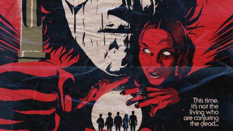 We zoom into a creepy mansion with a bunch of people in dark robes. A woman with white eyes sits at the crystal ball, and we see things on the TV.