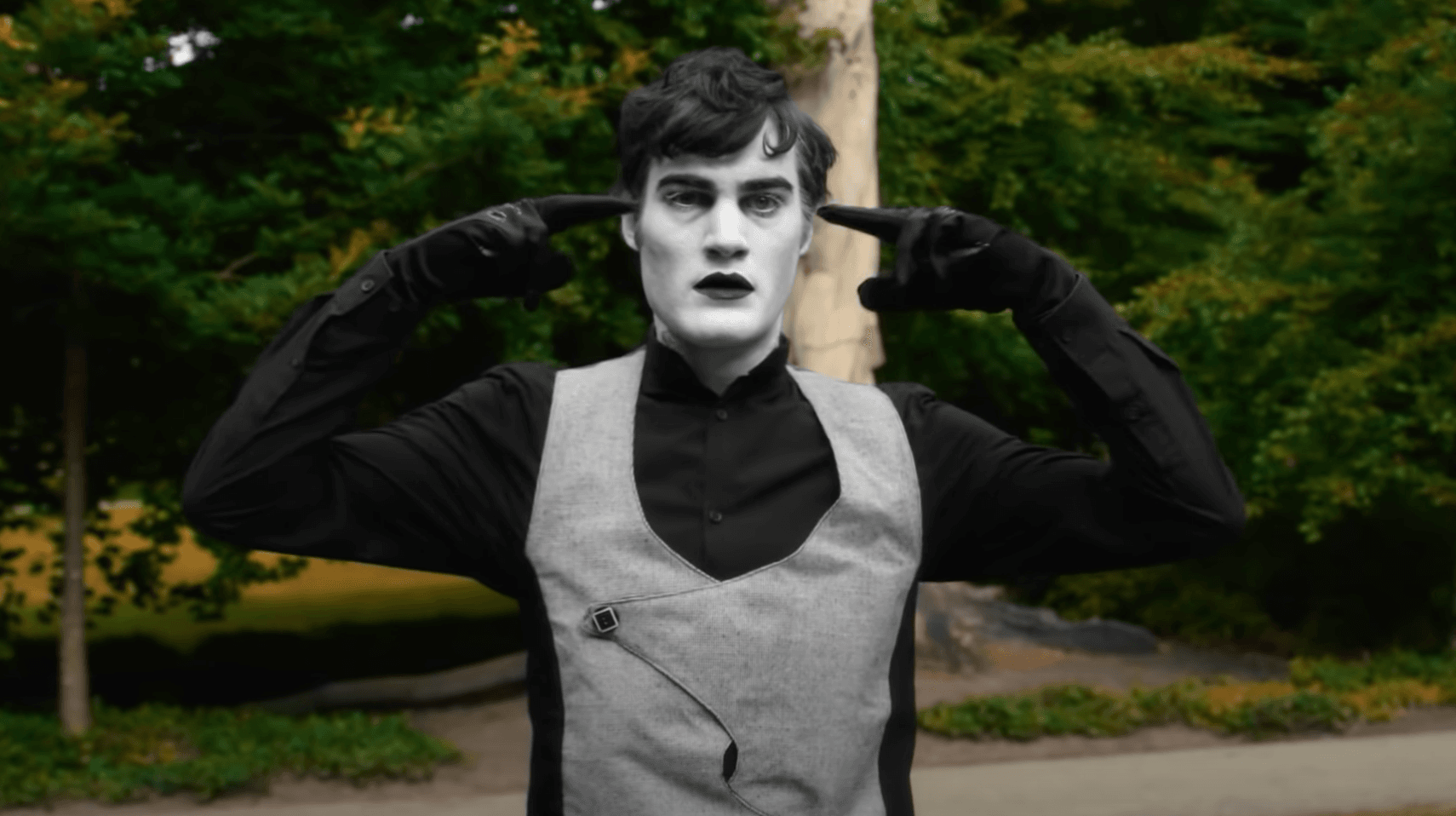 We open in a park while the mime “reads a book.” We soon see that as the mime does mime-y things with his hands, that things aren’t as imaginary as they should be. A litterer finds out the hard way not to do that. A group of university freshmen comes marching over; they’re in some kind of hazing activity and are being yelled at by a bully. The bullies notice the mime sitting alone nearby, and of course, they just can’t leave him alone.
