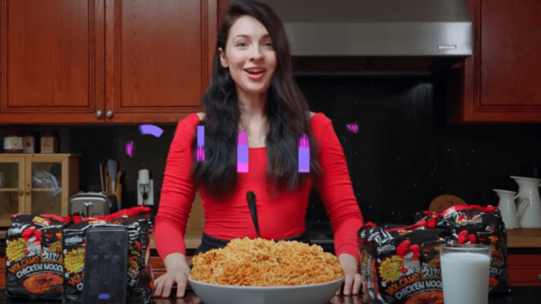 Carly is doing a cooking show. “Today we’re doing the Korean Fire Noodle Challenge,” she tells the camera. There’s a HUGE bowl of noodles in front of her. Twenty packages of Korean fire noodle ramen. The current record is fifteen packs. She starts her timer and starts chowing down.