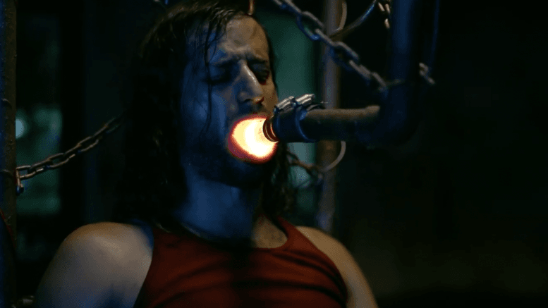 A man is chained to a chair with a lit lightbulb in his mouth. His hand is affixed to the chair arm with some kind of metal contraption over his ring finger.