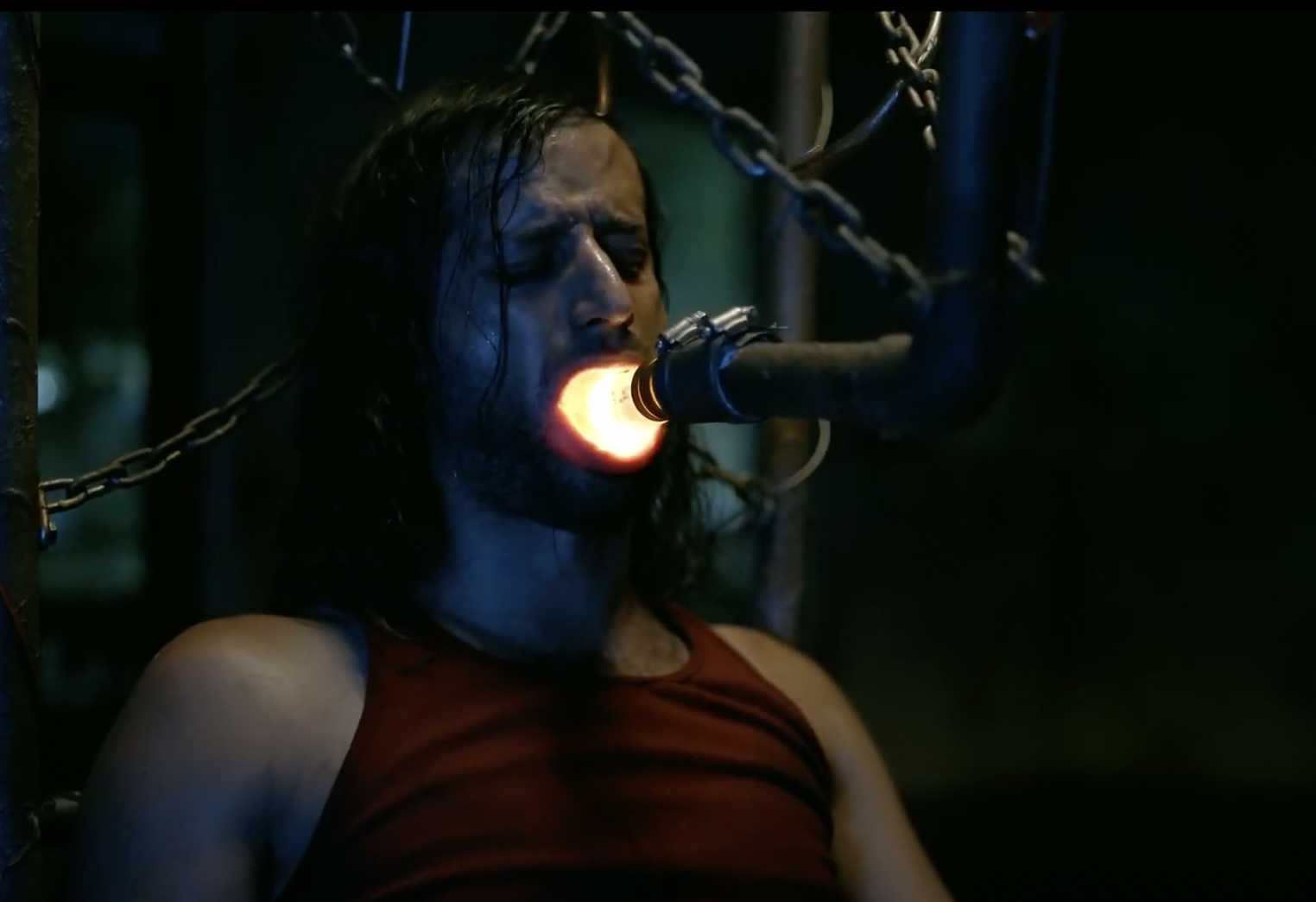 A man is chained to a chair with a lit lightbulb in his mouth. His hand is affixed to the chair arm with some kind of metal contraption over his ring finger.