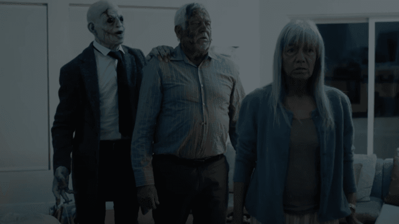 A woman lies in bed and watches an old video. She’s watching a recording of her and her husband on vacation. She watches a creepy man-thing appear behind her husband in the video– and then she sees it outside her window… alongside her dead husband.