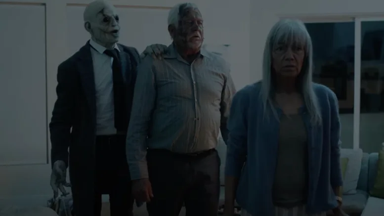A woman lies in bed and watches an old video. She’s watching a recording of her and her husband on vacation. She watches a creepy man-thing appear behind her husband in the video– and then she sees it outside her window… alongside her dead husband.