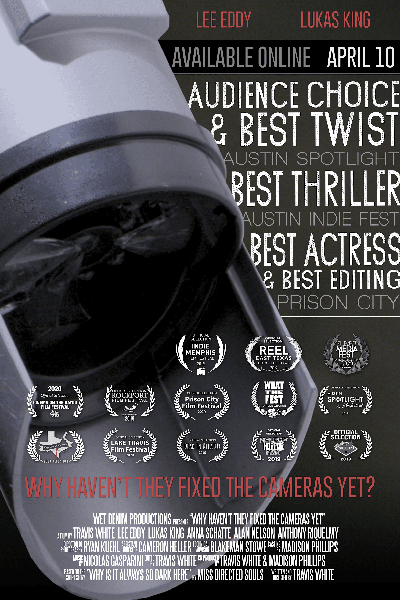 Written & Directed: Travis WhiteStarring: Lee Eddy, Lukas KingRun Time: 4:40Link: https://www.youtube.com/watch?v=GXXIXSwMzcY Synopsis A woman runs to her car in fear in the parking garage. She thinks to herself “Why haven’t they fixed the cameras…